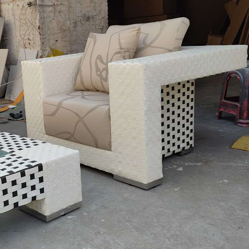 This sets of outdoor&patio&garden sofa are inspired by Fendi Casa New Port Outdoor collection.In most cases, Fendi Casa focuses on indoor furniture.But at the strong request of some Fendi Casa fans,Fendi Casa designed this new port outdoor&patio&garden collection for one project.This new port collection includes sofa,coffee table, dining table,armchair and chaise loungers.First the way of weaving makes it different from other outdoor furniture.The PE strap is 2.2cm width ,white and brown color cross each other,creating very special sense of relaxing.To make this sets of sofa and the coffee table same style as the sofa, we specially custom made the fabric.Based on outdoor sunproof fabric, we print pattern on the fabric to meet customer\'s requirement.We have no the data of original design, we just make this sofa and table based on photo.Compared with the original design, our color looks more black and white instead of brown and white.But customer is satisfied with the sofa and coffee table.