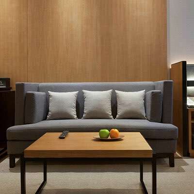 This hotel fabric sofa was designed by Designer Huang for Designer S Hotel ,who worked in Huanghe Design Interior.Artech,professional hotel furniture supplier,customized the small size to match the limited room space.This bedroom sofa is made of solid wood base frame and upholstered body.For this hotel lounge sofa, the lines are very straight because designer tried to save the space.Anyway ,this sofa for bedroom is very comfortable with two rectangle cushion supporting the arm.